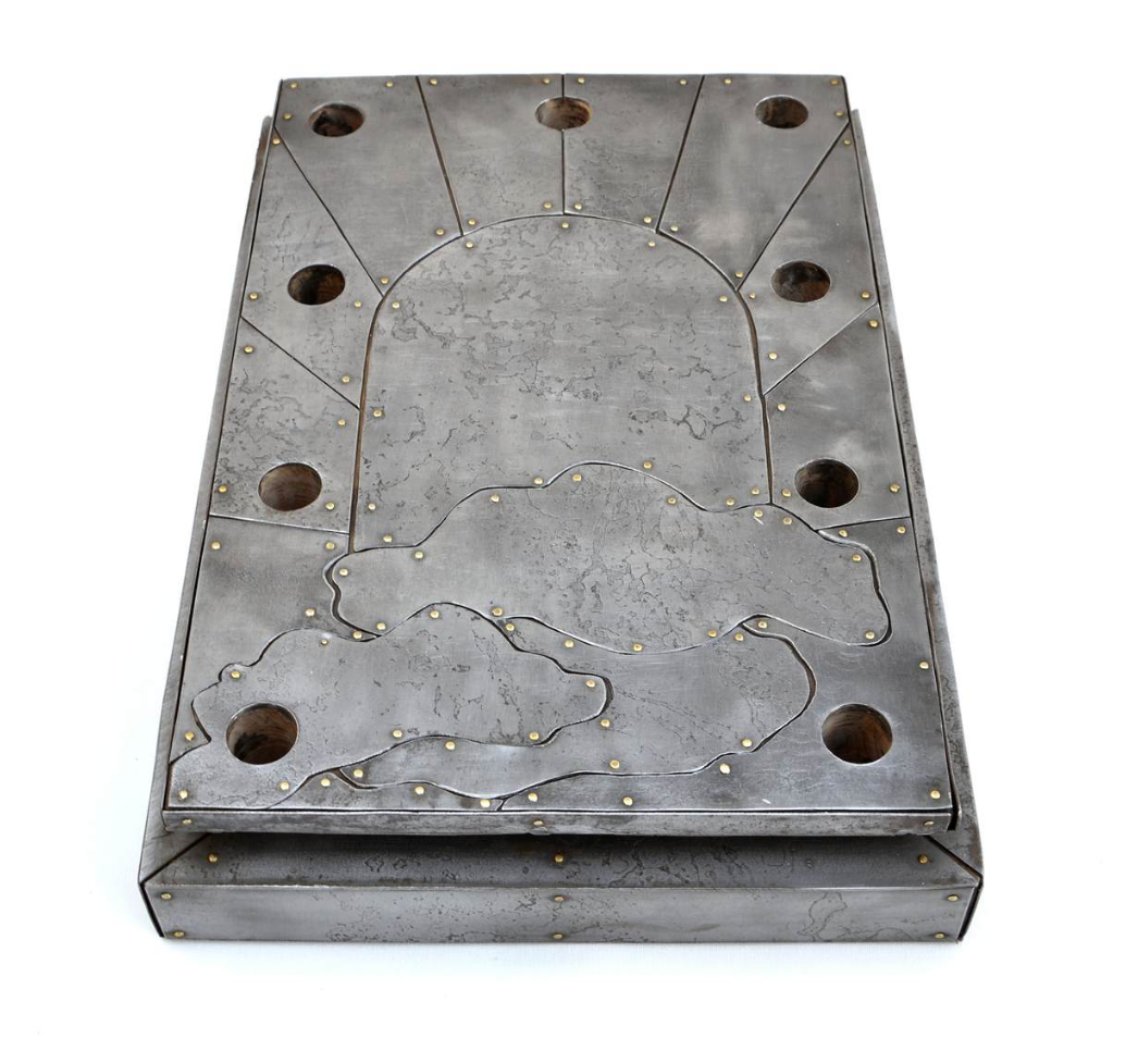 Three metal receptacles working as inhouse altars. The first one is supposed to be used with flowers, composing a crown around one beloved item. A depth in the vision is also alowed by the long pedestal where you can place your item. The second, is a sort of fire temple, with candle columns. This one protects your precious object with its floating little dying fires around. Made with help from François Spannagel. The last one is made as small stairs, you can lift it as a holy shrine. Here few favorite items can be staged on different levels.