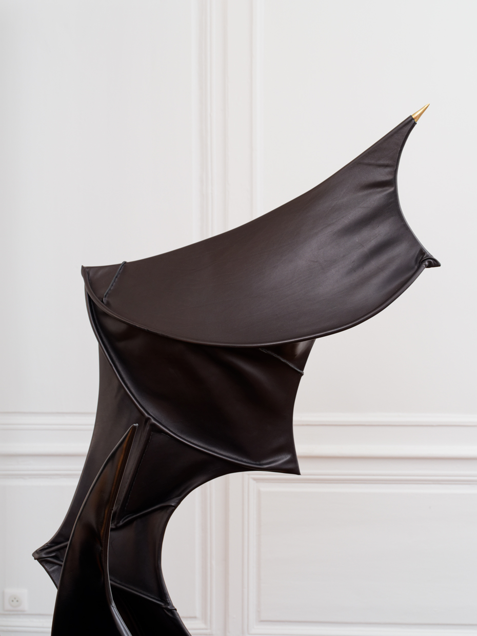 During her residency, Jenna Kaës discovered the various trades practiced at the Maroquinerie de la Tardoire, in Montbron (in the central western French department of Charente). Immersing herself in local traditions, folklore and myth, she was drawn in particular to the fadet, a legendary, often mischievous creature associated with the world of fairies or pixies. This research resonated with her fascination for bats – nocturnal animals often attributed with evil powers, in the Western tradition. At the outset of her residency, Jenna Kaës visited the Château de Rochechouart, which immediately became integral to the mindscape of her project. Accompanied by artisans at the leather workshop – notably Cécile Coiteux and Emmanuel Villette – Jenna Kaës worked with off-cuts of black tanned leather, highlighting their mottled texture, and mounting them on brass frames to form majestic wings around a body in hand-blown glass. The resulting four pieces, in two different sizes, compose a family of hybrid creatures, alluring and troubling in equal measure.